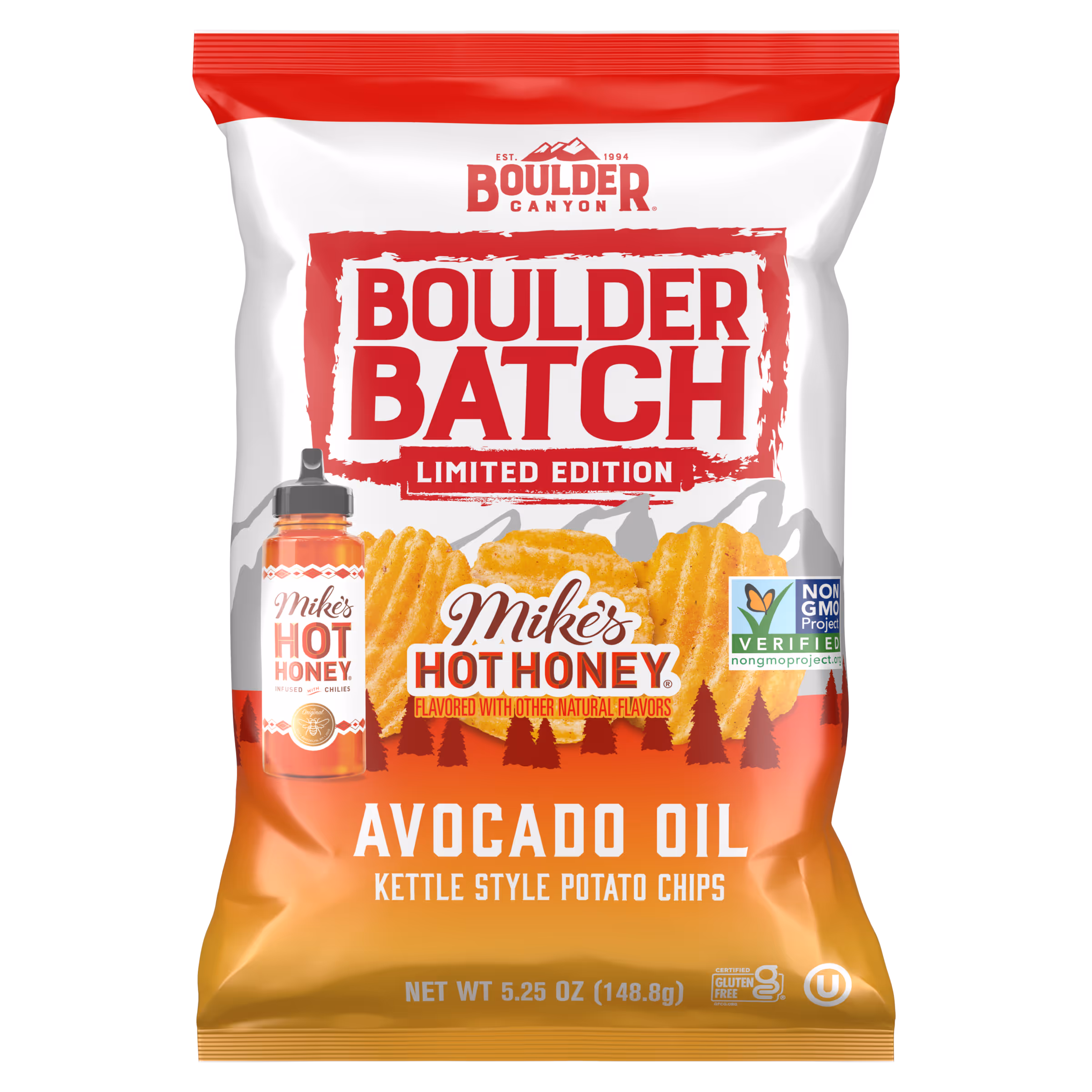 Our limited-edition Boulder Batch™ brings the bold flavor of Mike’s Hot Honey® to our signature kettle-cooked avocado oil chips. Each bite delivers the perfect balance of sweet honey and slow-building spice, all wrapped around the smooth, buttery taste and satisfying crunch you expect from Boulder Canyon. Crafted with carefully selected ingredients and inspired by the spirit of the outdoors, this sweet-heat collab elevates snack time to a whole new peak.